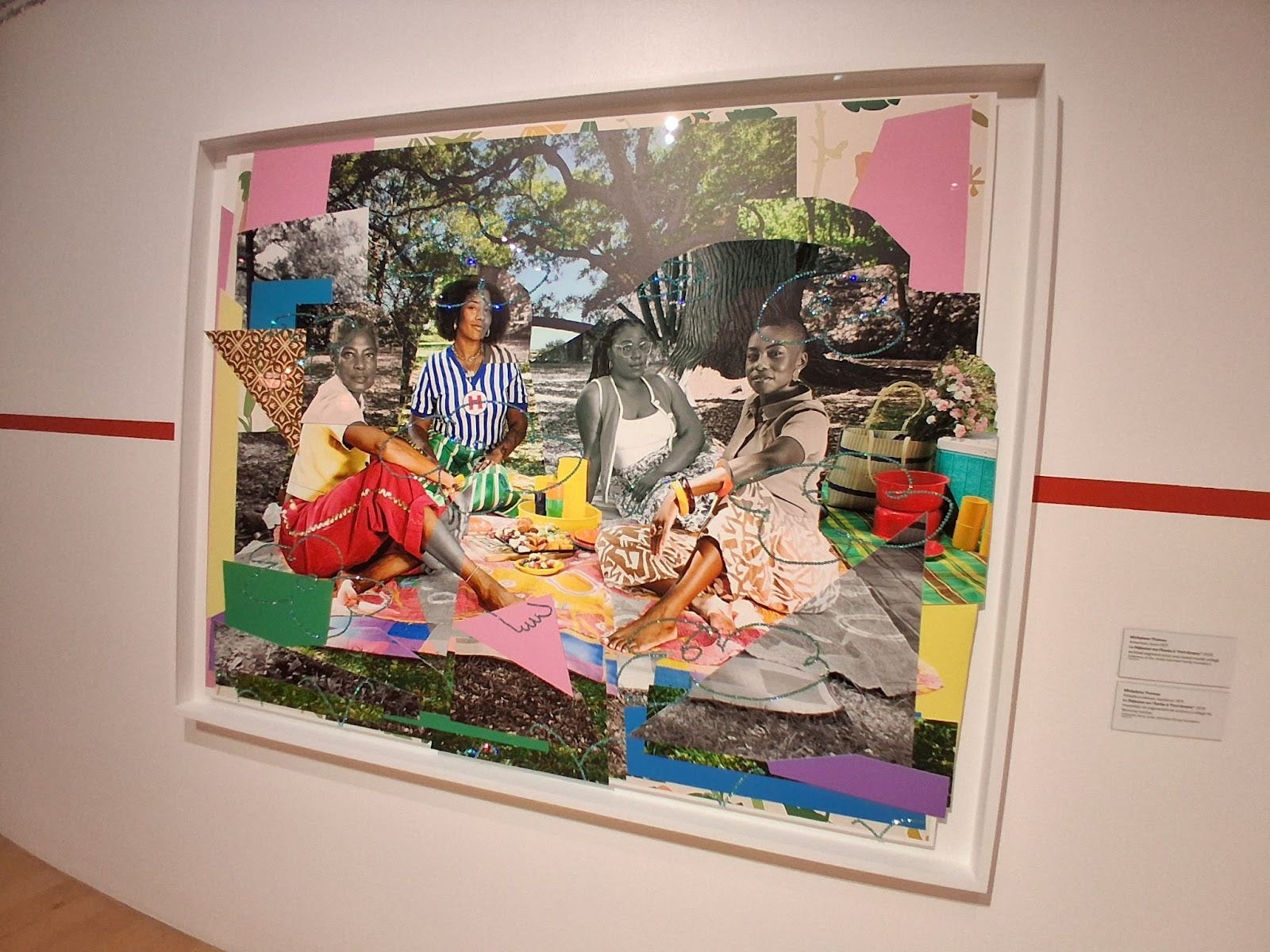 Born in New Jersey, Mickalene Thomas is a queer black woman whose paintings and collages are equal parts dazzling and mesmerizing. Her exhibit is paired with another artist I forget, but a theme I do not; bodies, agency, and erotic beauty. The work reminded me of my class I took over the summer about sex and bodies. A visual expression of Lorde’s use of the “Erotic as Power”. Her work requires time to appreciate the myriad of colors and textures. Sequins, black and white magazine cutouts, and the old masters occupy equal space. The piece that commanded my attention most was “le déjeuner sur l’herbe: fort green1”. The dresses of the women and their subtle expression captured a peaceful, fleeting moment that made me wistful, and recall all those summer evenings I spent at the lakefront with my friends.